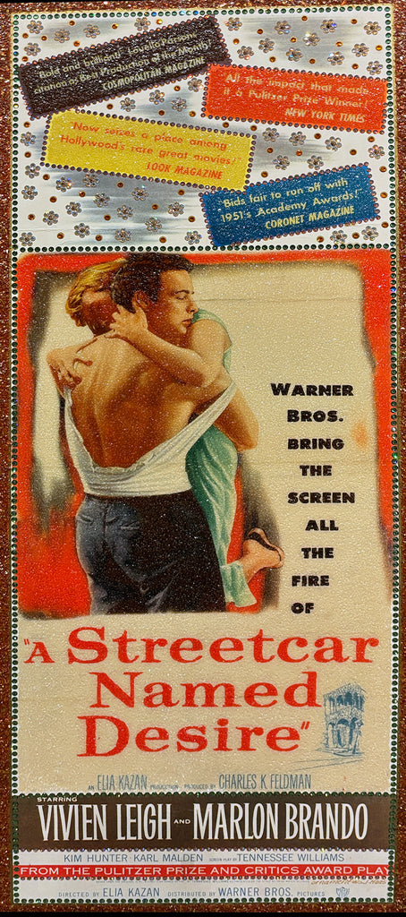 Original movie insert from the 1951 film based on Tennessee Williams play A Streetcar Named Desire. Starring Marlon Brando, Vivian Leigh, Kim Hunter and Karl Madde. Hand embellished by artist Judy Haas with Austrian crystals, diamond dust and other elements. Price includes Italian dark walnut wood frame. 17 1/2 x 39 1/2. Before and after photos. To see how the crystals really sparkle watch the short video.